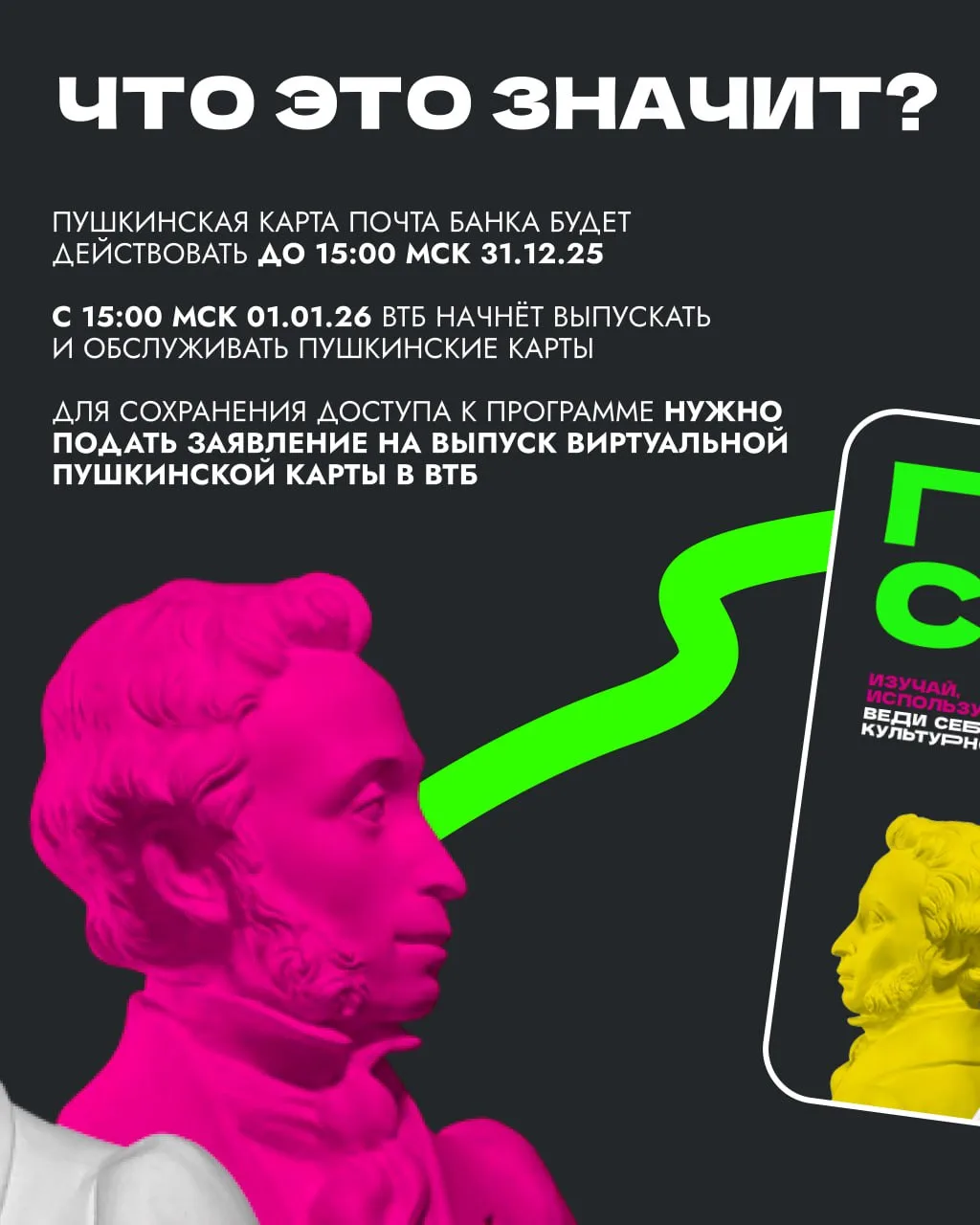 С 01.01.2026 оператором программы «Пушкинская карта» стал Банк ВТБ (ПАО). В связи с данным изменением Пушкинская карта Почта Банка будет заблокирована.